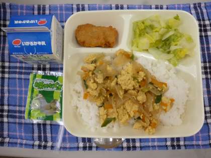 2月15日の給食は「かつ丼」「白菜の甘酢和え」「抹茶豆」です。かつ丼は食べ応えがありとてもおいしくいただけました。
