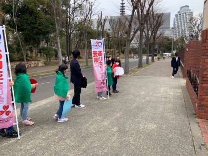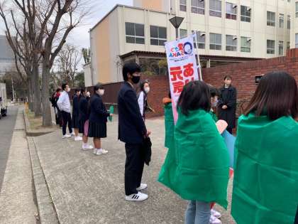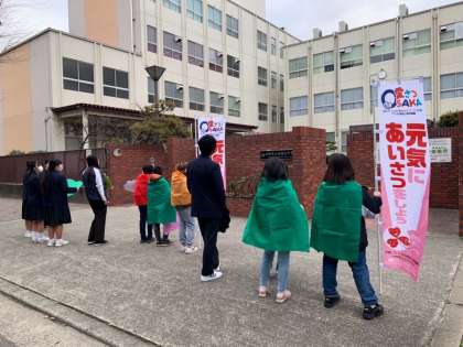 児童会と南港北中学校の生徒会の合同あいさつ運動は場所を南港北中学校に移して実施しました。しっかりとあいさつをアピールしていました。