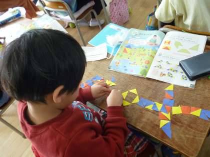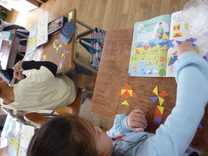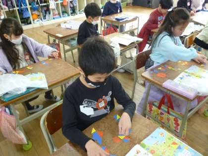 1年生は算数で「かたちづくり」の学習をしました。カラーの三角形を切り取り、組み合わせて形を作っていきました。家や魚など楽しい形を作っていました。