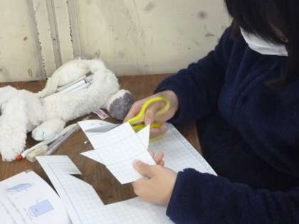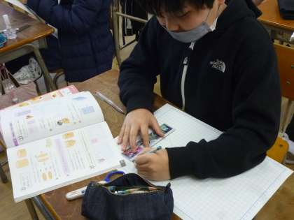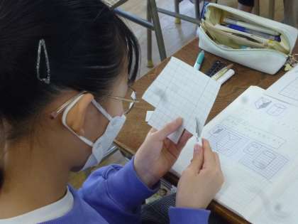 5年生は算数で三角柱について考えていきました。展開図を書いて組み立てる活動を通して辺や頂点の重なりについて調べていきました。