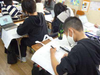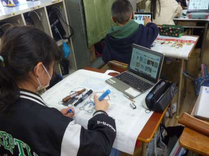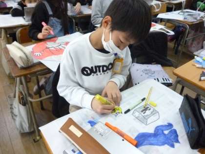4年生は絵画や習字の作品を入れる作品袋に絵や文字をかいていきました。きれいに仕上げようとタブレットでデザインを調べていました。