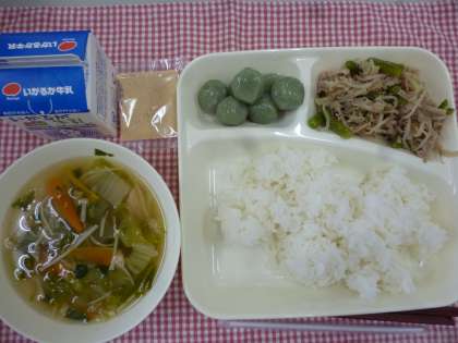 鶏肉と3月7日の給食は「鶏肉と野菜の炒めもの」「すまし汁」「きな粉よもぎだんご」です。団子はきな粉の甘い味でおいしくいただけました。