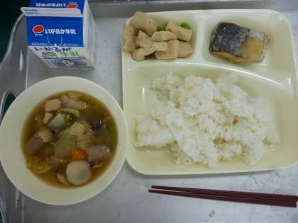 3月9日の給食は「さごしのおろしじょうゆかけ」「里芋と野菜の含め煮」「高野どうふの煮物」です。和食でどの献立もご飯によく合う味でした。