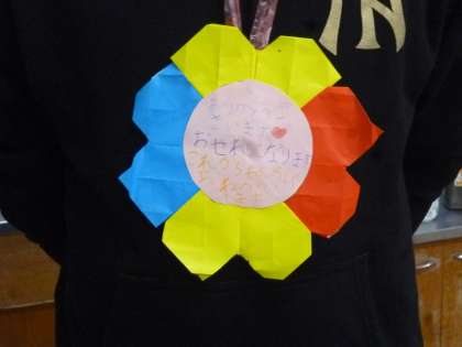 1年生は教職員にお礼の気持ちを伝えるため、写真のような「ありがとうの花」を作り、プレゼントをしました。しっかりしたお礼の気持ちがよく伝わってきて、みんなうれしく感じました。1年生のみなさん、ありがとう。