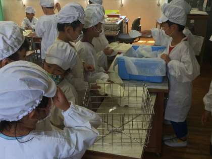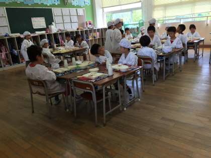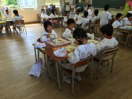 2学期最初の給食を食べました。1年生の教室では、みんな嬉しそうな顔をして配膳を待っていました。暑さがきびしい期間は、以前よりずっと長くなっています。学習にしても食事にしても、意欲減退は無理もありません。よくがんばっていると感心します。来年度は、エアコンを設置するので、今年だけはがまんしてくださいね。