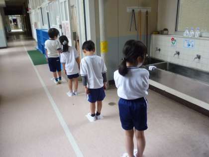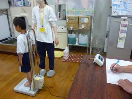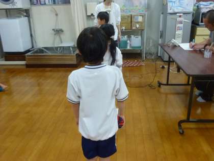 1年生は入学して間もないので初めての活動が続きます。今日は発育測定をしました。廊下の並び方から保健室の入り方、保健室に入ってから靴下を脱ぐなどの一連の動きを教えてもらい、身長と体重を測ってもらいました。身長と体重を同時に測れる機器で、数値は担任の前のモニターに示されるので、プライバシーに配慮しています。
