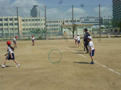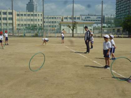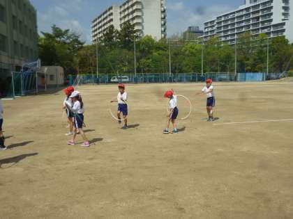 2年生はフラフープを使った運動をしました。まず一人で腰の上で回す運動をし、次に二人組でフラフープを転がしてパスをしていきました。
