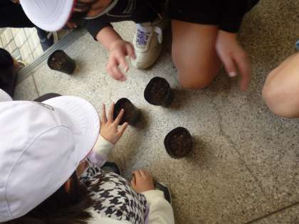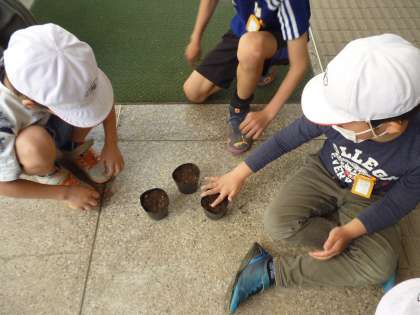 4年生はヘチマとヒョウタンの種を蒔きました。一人一人、ポットにヘチマとヒョウタンを蒔いていきました。これから観察を続けていきます。