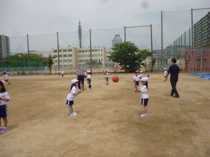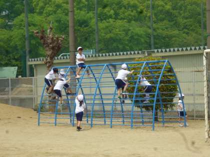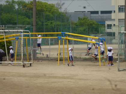 1年生ははじめて運動場で体育をしました。はじめに運動場の使い方を教えてもらい、雲梯を使った運動をしました。続いてボールをパスする練習をしていきました。
