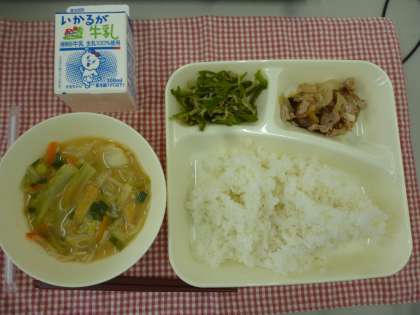 4月21日の給食は「豚肉のしょうゆ焼き」「みそ汁」「じゃこピーマン」です。しょうゆ焼きは肉にタレガよくしみておいしくいただけました。