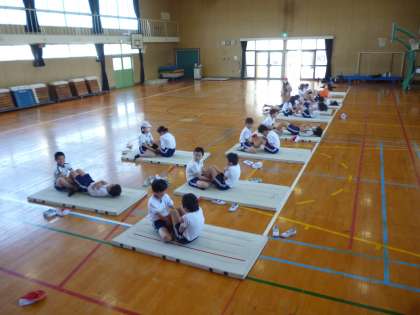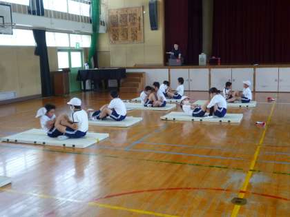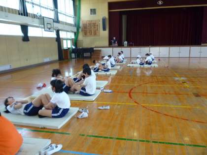 6年生は新体力テストを始めました。今日は「上体おこし」です。30秒間に上体を何回起こすことができるかを調べるテストです。記録を伸ばそうと歯を食いしばって体を起こしていました。