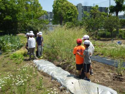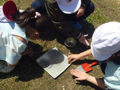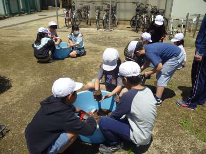 3年生はホウセンカの種を蒔きました。はじめに虫を見つける観察をし、その後ポットに土を入れ、指で穴をあけて蒔いていました。