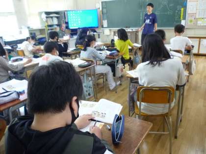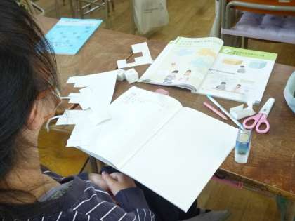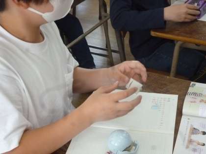 5年生は算数で立方体と直方体を学習しています。ボール紙に展開図を書いて、実際に組み立てていき、体積の求め方を考えました。