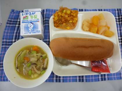 5月15日の給食は「豚肉と野菜のカレースープ煮」「変わりピザ」でデザートにミックスフルーツ」が出ました。変わりピザは一口サイズで、味もとてもおいしかったです。