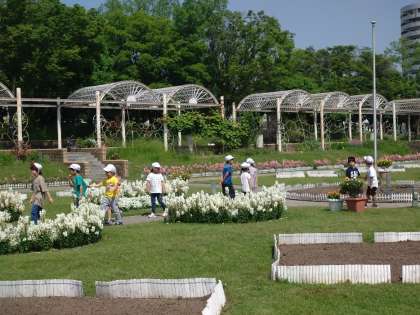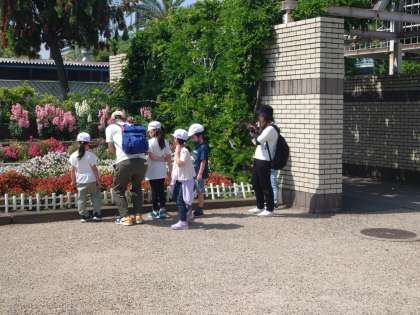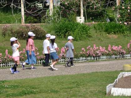 まずは1年生と2年生がペアグループになり、花壇の見学です。