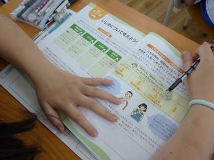 6年生は道徳で「言葉のおくりもの」の学習をしました。男女が仲良くお互いの良さを認めあい友情を育てていこうという心を育てる学習です。その教材を通して、いじめについても考えました。月曜日に校長先生から「いじめはぜったいだめ」というお話を聞き、子どもたちは、教材を通して自分たちの生活につなげて一生懸命考えていました。