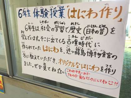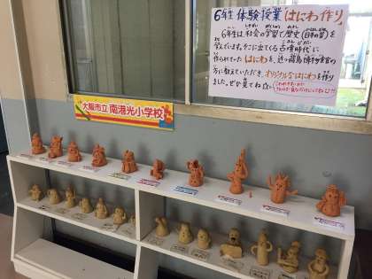 1学期に6年生が作成したはにわは、近つ飛鳥博物館に展示されていました。2学期になって、表彰状とともに学校に送られてきました。個性的なはにわは、玄関に展示しています。