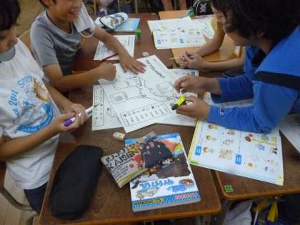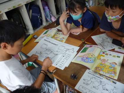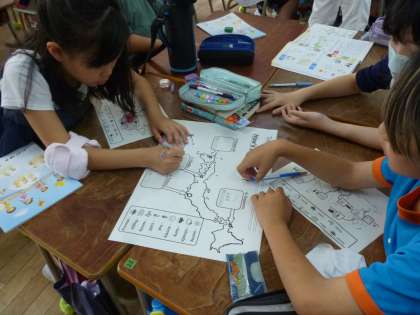 4年生は外国語活動で、天気を英語で書いていきました。日本の地図の都市に、班で考えた天気を「sunny]など英語で記入していきました。