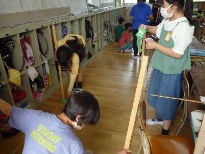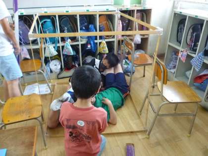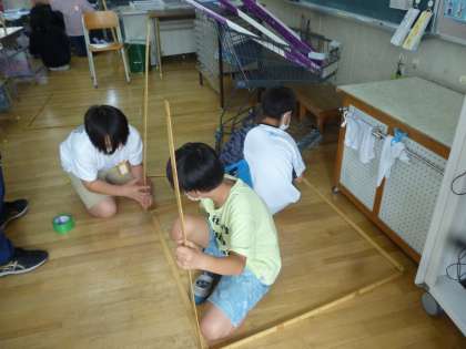 5年生は1mの物差しを使って1㎥の形を作りました。1mの物差しが辺になり、完成すると1㎥の中に入って大きさを実感しました。