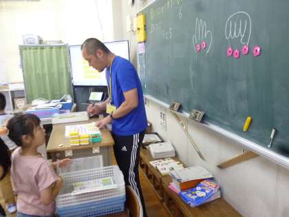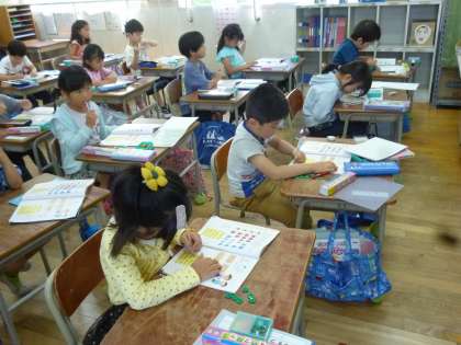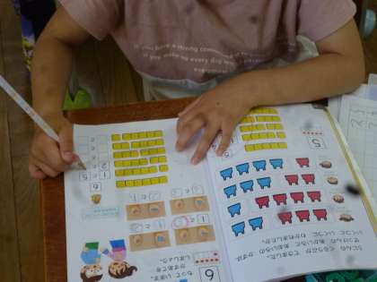 1年生は数の分解の学習をしました。「6」を「2」と「4」、「1」と「5」のように2つに分解する学習をしました。「3」と「3」、など、答えを導いていました。