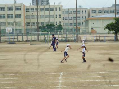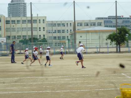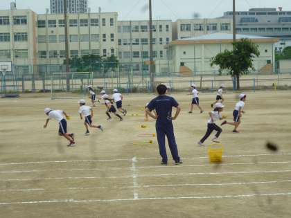 3年生は走る練習をしました。腕を振るなど速く走る工夫をしながら練習しました。中間地点に置いたボールを、左右のチームではやく取り合うなどゲームも取り入れて楽しく進めました。