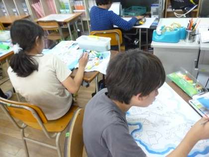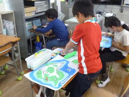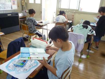 4年生は絵の具で楽しい島を描きました。島には動物や花など、楽しくなるイメージで描いていきました。