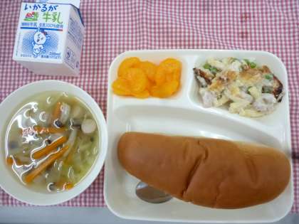 5月29日の給食は「マカロニグラタン」「キャベツのスープ」でデザートに缶詰のみかんがでました。グラタンはどの種類でも人気の献立です。