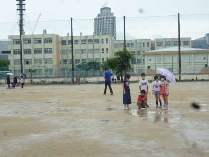 4年生は理科の学習で、運動場の水たまりの行方を調べました。目で水たまりの水がどのように流れているかを調べ、ビー玉を入れた箱を運動場において、地面の傾きも調べました。運動場は周辺に排水溝があり、真ん中が高く周辺に水が流れる構造になっています。そのことが今日の活動でよくわかりました。
