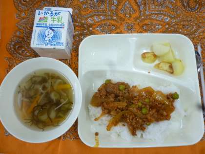 5月最終の給食は「タコライス」「もずくのスープ」「焼きじゃが」です。児童給食委員会のメンバーは毎日、給食時に献立の説明をします。今日のタコライスの説明です。「タコライスという名前は、メキシコ料理のタコスの具をご飯にのせることから、名前がついたといわれています。沖縄で人気の料理です」。知らないことがいろいろあり、知識が広がりました。