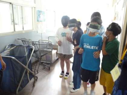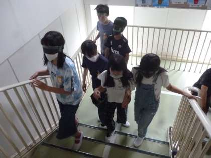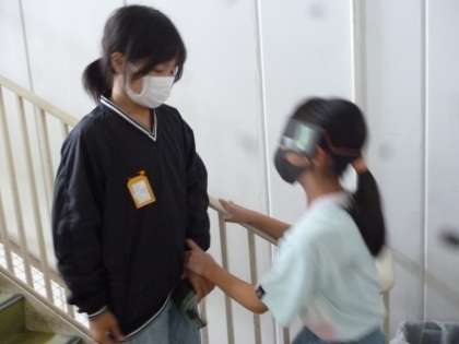 5年生は総合の学習でバリアフリーについて考えています。先週は車いす体験をして、社会の中で段差をなくすことが必要であることに気づきました。今日は視覚障がいについて考える体験をしました。体験児童が目隠しをし、介助児童が校舎内を案内していきました。