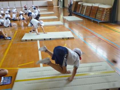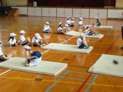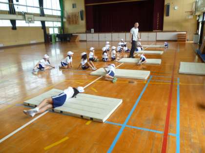 1年生は初めてマット運動をしました。体を丸めて背中を中心に前後に動かしたり、体を真っすぐにしてマット上を転がるなど、基本的な運動をしていきました。