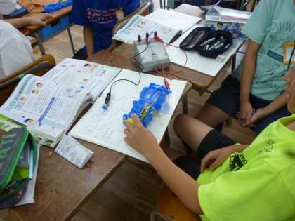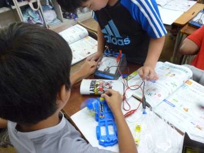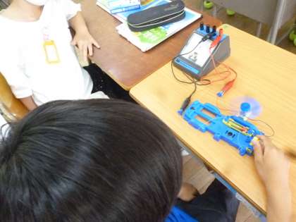 4年生は電流の流れについて調べました。回路に検流計を取り付け、電池の向きを変えることで電流の流れる方向が変わるかを確かめました。電池の向きが変わると電流の流れが逆になること、モーターに付けたプロペラの逆にまわることがよくわかりました。