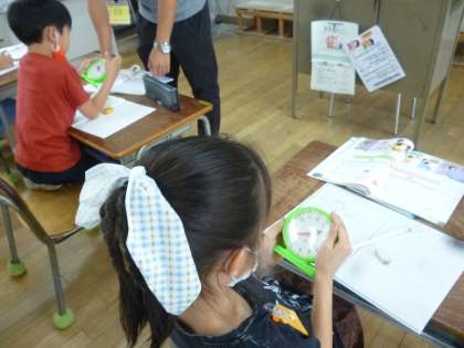 2年生は時刻と時間について学習しています。アナログの時計の算数教具を使って学習しました。午前と午後の違いについても習い、時計の読み方を針を動かしながら学びました。