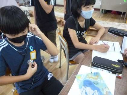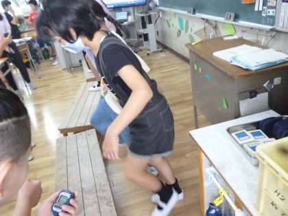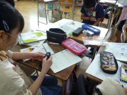 6年生は理科「人の体」で、脈拍を調べました。運動前の脈拍と運動後の脈拍を測り、その違いを調べました。踏み台昇降の運動を行い、脈拍測定器と聴診器を使って脈拍と心臓の鼓動を測っていきました。