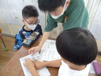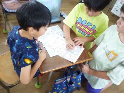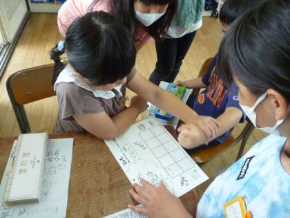 明日はみんなが楽しみにしている「光まつり」です。2年生と5年生はペアになって回るので、店を回る順番を相談していました。