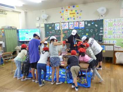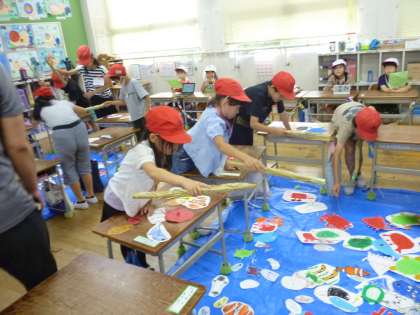 。各学級のお店を順に紹介していきます。まず、1年生の「さかなつり」です。自分たちが描いた魚やかになどにクリップが付いており、釣り針の代わりに磁石がついた竿(新聞紙)で釣ります。簡単のようでなかなかクリップに磁石が付かず、達成感を味わうことができる内容です。