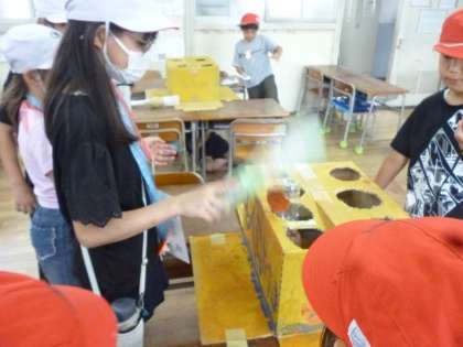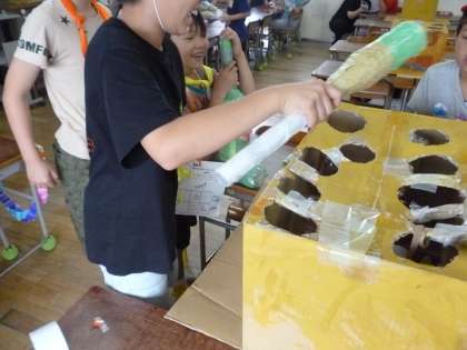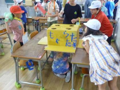 3年生のお店は「もぐらたたき」です。段ボールの箱の上に6個ほどの穴が開いており、そこからペットボトルの「もぐら」が出てきます。ゲームセンターでポピュラーなゲームなので、みんな懸命に「もぐら」をたたき、とても楽しんでいました。