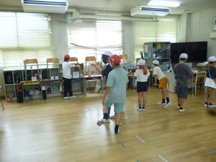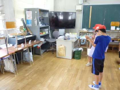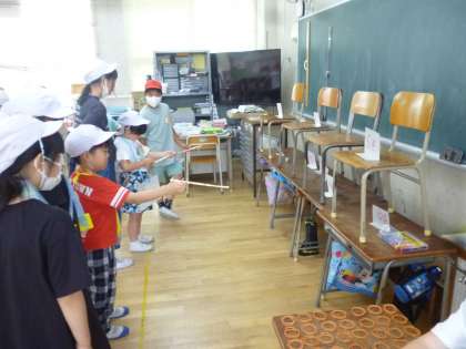 5年生のもう一つのお店は「しゃてき」です。割りばし鉄砲で的を当てるゲームです。みんな慎重に狙いをすませて的を狙っていました。上級生が下級生の鉄砲に輪ゴムをかけてやるなど、優しい場面がたくさん見られました。