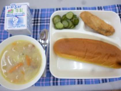 6月19日の給食は「サーモンフライ」「豆乳スープ」「きゅうりのバジル風味サラダ」です。サーモンフライはサクッとした歯触りがよく、人気の献立です。