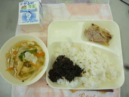 6月21日の給食は「豚肉の甘辛焼き」「五目汁」「のりのつくだ煮」です。つくだ煮はご飯によく合う味でした。