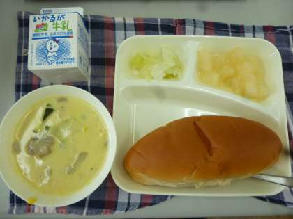 6月23日の給食は「かぼちゃのクリームシチュー」「キャベツのゆずドレッシング」で缶詰の和梨がでました。シチューにはかぼちゃがよく合っていました。