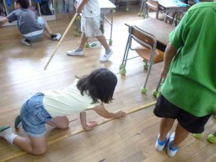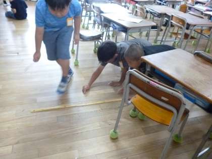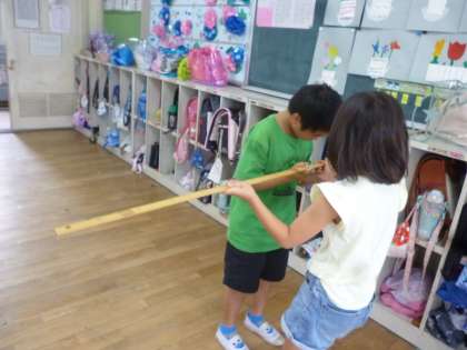 3年生は長さの学習で教室の縦と横の長さを測りました。1mの物差しを使って、1mが何回と残り何センチかで教室内の長さを求めました。