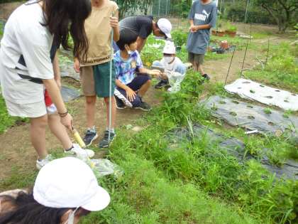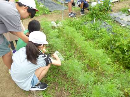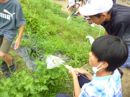 6年生は学習園に植えられた植物の葉にビニル袋をかぶせて、時間が経つと袋の中の酸素が増えているかどうかを調べました。気体検知管の扱いにも慣れてきたのでスムーズに実験を進めていました。