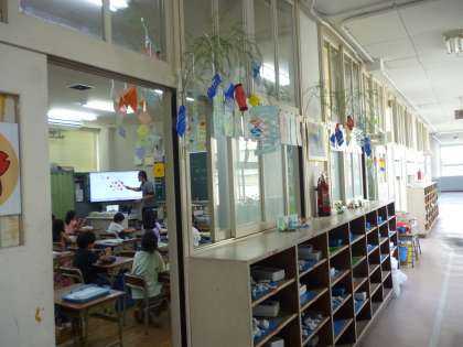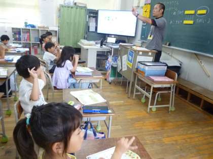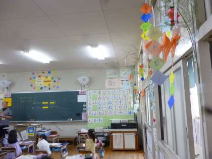 1年生は短冊や笹飾りを作りましたが、それを笹に付け、教室の入り口に飾りました。七夕ムードの中、算数は「引き算になる問題」を学習していました。