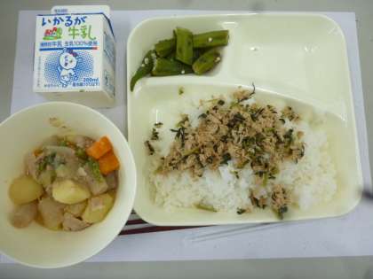7月12日の給食は「豚肉とじゃがいもの煮物」「オクラの梅風味」「つなっ葉いため」です。つなっ葉はご飯によく合う味でした。