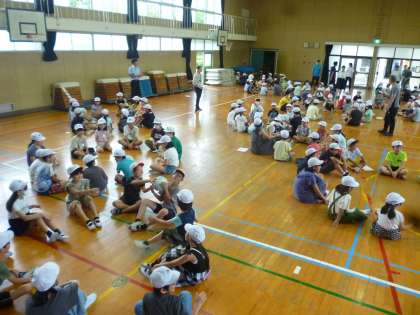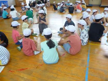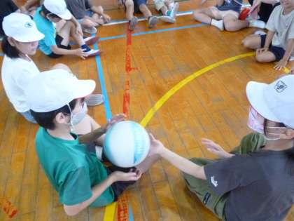 今日の児童集会のゲームは「ボール回し」です。たて割りグループで輪になって座り、ボールを順番に回していきます。音楽が鳴っている間は次々に回していき、音楽が止まった時にボールを持っていたらアウトになります。わざとボールを回すのを遅らせたりするなど、みんなとても楽しんでいました。