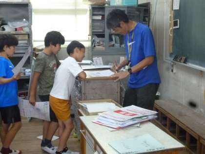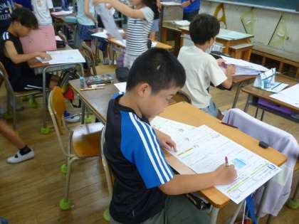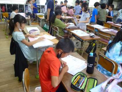 4年生は1学期最後の学習のまとめでテスト直しをしました。答えを確認して訂正し、担任に見せて〇をもらいました。