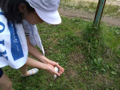 なかなか魚をつかむのが難しいですか、魚をつかんだら笑顔です。