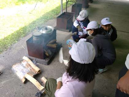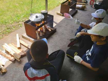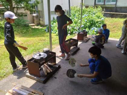 かまどには火が入り、飯ごうや鍋を置いて炊けるのを待ちます。