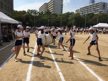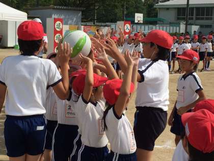 全校児童による大玉はこび競技でした。今年は2種類の運び方で実施し、引き分けでした。